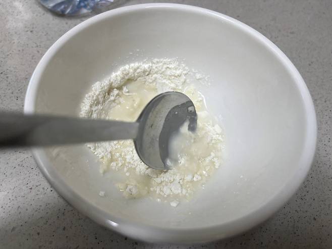밀가루 또는 튀김가루 1스푼에 물을 넣어 가루를 풀어 주세요. 가루와 물의 양을 1:5 정도로 맞춥니다.