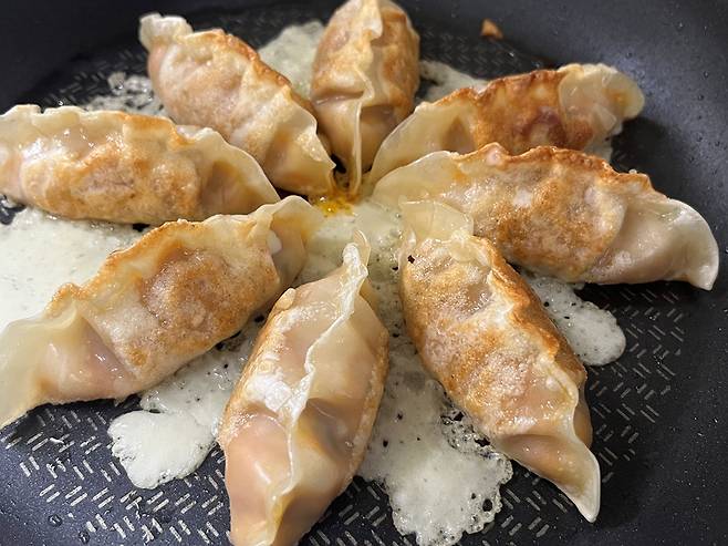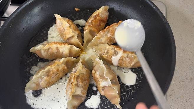 반죽물이 반두 아랫부분으로 들어가 익으면서 만두 식감이 훨씬 바삭해집니다. 반죽물이 살짝 노릇해지면 불을 끄세요.