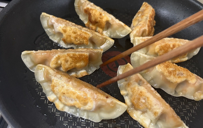 냉동만두 구울 때는 만두의 3면을 골고루 익혀야 합니다. 바닥 면이 노릇해지만 만두를 돌려서 다른 면도 익히세요.