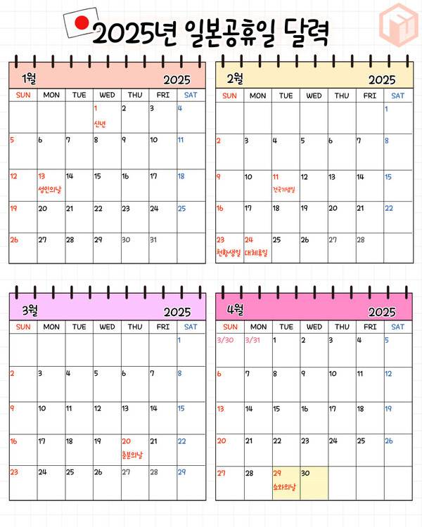2025년 일본 2월 공휴일은 2월 11일 건국기념일, 24일 천황 탄생일 대체 휴일이 있으며 3월에는 20일 춘분의 날, 4월에는 29일 쇼와의 날이 있습니다.