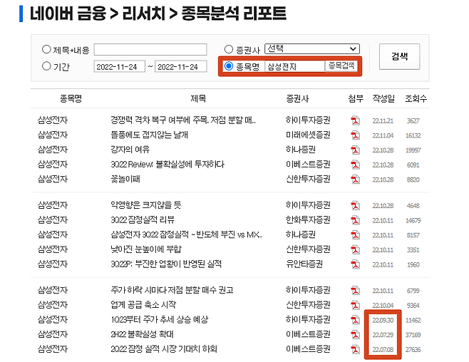 검색 결과를 확인해보니 삼성전자는 코스피 시가총액 1위인데 2022년 7월은 잠정 실적 및 확정 실적 발표도 있었는데 올라온 ‘리포트 개수가 너무 없는 것 아닌가’하는 생각이 드시지 않나요? 8, 9월도 마찬가지이고요.