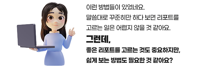 그래서, 지금부터 리포트를 고르는 기준을 무엇으로 할지, 내용은 어떻게 보면 되는지에 대해 알아보겠습니다.