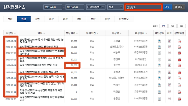 이럴 땐 한경컨센서스에 들어가서 삼성전자를 다시 검색해서 확인해보는 즉, 다른 곳에서도 더 찾아봐야 한다는 생각을 해보셔야 합니다.