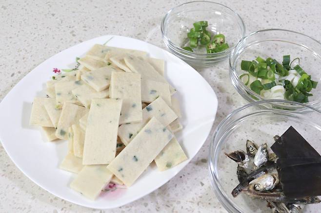 무는 나박썰기나 반달 모양으로 얇게 썰고, 어묵은 한 입 크기로 자릅니다. 대파는 송송 썰어 준비합니다.