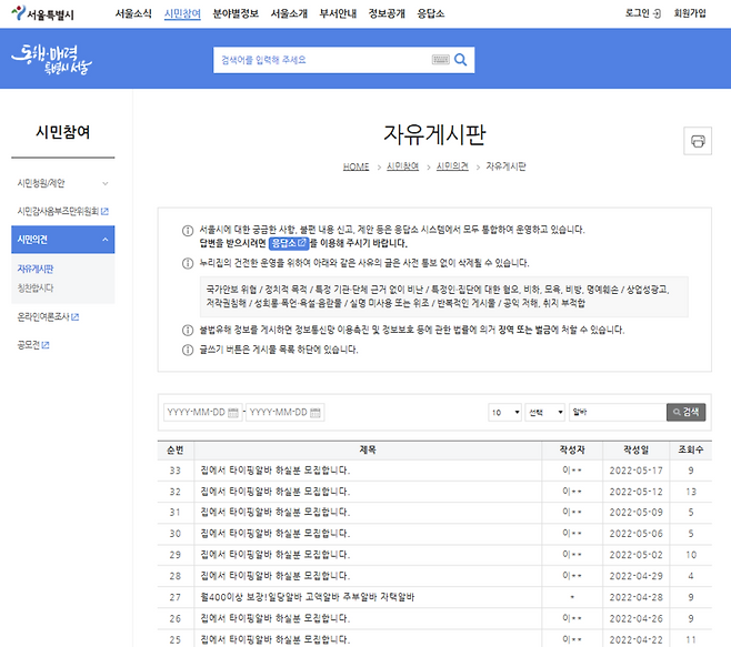 가령 구글에서 '청소년지원센터 고액 꿀알바' 등의 키워드로 검색하면 서울시 공공기관 문의게시판에 올라와 있는 불법 의심 광고가 검색되는 식입니다. 해시태그도 키워드로 포함될 만한 여러 단어들을 나열해 검색 포털에 노출되기 쉽게 만든 점도 특징입니다.