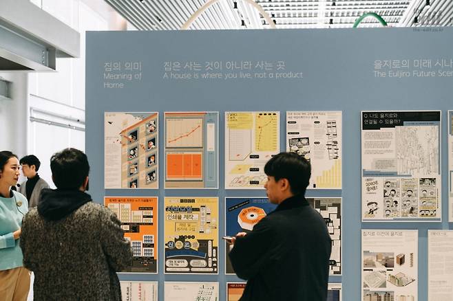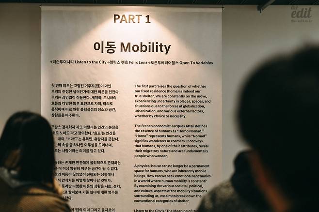 파트 1에서는 리슨투더시티의 <집의 의미 그리고 을지로의 미래 시나리오>(2023)를 먼저 만나볼 수 있다. 전시의 전체 구성에서 이 작품을 왜 처음에 배치했을까를 생각하면 아무래도 ‘집’이라고 했을 때 가장 먼저 떠오르는 게 물리적인 형태의 집이기 때문이다. 큐레이터 역시 거주지에 대해 말하기 위해서는 물리적인 형태의 집을 다루지 않을 수 없어서 파트 1에 이 작품을 배치했다고 한다. 니체는 자신의 철학을 설득하기 위해 먼저 작업한 건 서양철학의 근간을 이룬 생각들을 망치를 들고 부순 일이다. 쉘터에 대한 새로운 접근을 위해서는 기존에 갖고 있던 우리의 생각이 무엇인가를 알아야 한다는 점에서 현실적인 거주 문제를 다룬 리슨투더시티가 첫 번째로 배치된 게 좋았다.