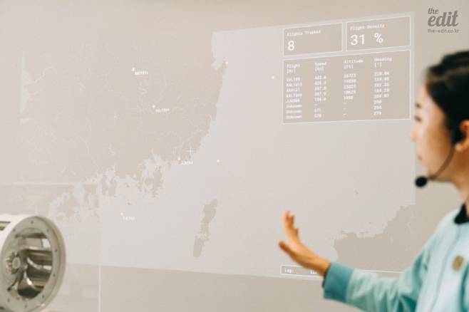몇 발자국 이동하면 용도를 알 수 없는 기계와 빔프로젝터 화면을 볼 수 있다. 두 번째 작품, 펠릭스 렌츠의 <정치적 기류>(2020)다. 이 작품에서 말하는 쉘터는 ‘비행기’다. 현재 부산 근처에서 몇 대의 비행기가 운항 중인지, 고도는 몇인지를 알 수 있고, 심지어는 항공기 넘버를 통해 어떤 항공사의 비행기인지도 유추 가능하다(군용기는 정보가 뜨지 않는다). 이 작품은 그 이름에서 유추할 수 있듯 정치적 상황이나 국제적 분쟁 등 다소 무거운 주제로 인해 이동해야만 하는 상황에 대한 내용을 담고 있지만, 일반 관람객들에게는 단순한 비행기를 타고 여행을 떠나는 것처럼 가벼운 이동성을 상기시키기도 한다는 점이 흥미롭다.