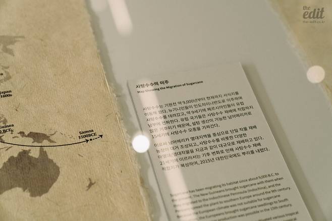 아키타입의 <아열대로부터>(2023)는 개인적으로 흥미로웠던 작품이다. 사탕수수와 인간의 이동을 동시에 보여주는데 선후 관계를 알 수는 없다. 환경 변화에 따라 경작지가 이동하는 것인지, 사람이 이동하면서 경작지가 이동하는 것인지. 분명한 건 인간으로 태어난 이상 자연과 공존하고 살아가야 하는 이유를 느끼게 해준다는 점이다. 가장 흥미로웠던 부분은 사탕수수로 살펴보는 한국의 이주사. 몇 십 년 동안 급변하는 세계 정세에서 생존하기 위해서 한국인이 어디에서 어디로 흘러갔는지를 살펴볼 수 있다. 그래픽으로, 지도로 단순하게 표현되어 있지만, 그림 너머에서는 슬픈 한국사가 느껴졌다. 예를 들어, 독립운동에 돈을 보태기 위해 하와이 사탕수수 농장에서 일하던 한국인의 삶 같은 것 말이다. 달콤함을 머금은 사탕수수를 따라 흘러간 한국사의 씁쓸한 아이러니다.