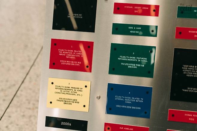 빔프로젝터 반대편에서는 노란색, 파란색, 빨간색 이름표가 붙은 설치물을 볼 수 있다. 컬러를 달리하여 영화를 구분해 놓았다. 노란색은 ‘국내 난민/이주민이 능동적 주체(감독/연출 등)로 직접 제작한 영화/드라마’를, 파란색은 ‘내국인 이주와 관련된 영화/드라마’, 빨간색은 한국인의 해외 이동 혹은 난민과 관련된 영화/드라마를 의미한다.