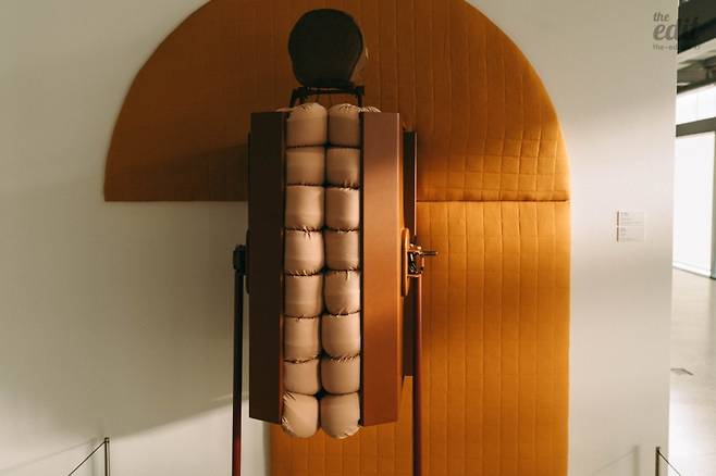 지금 소개하는 작품은 루시 맥래의 <압축 카펫 2.0>(2010)으로 일종의 ‘포옹 기계’다. 사람을 끌어 안으면 포근함, 안락함, 안정감을 느낄 수 있다. 따스한 온기, 두근거리는 심장 박동, 숨소리는 그 자체로 위안을 준다. 작가는 인간의 포옹을 기계로 대체할 없을까 고민하며 이 기계를 만들었다고 한다. 이번 전시에서는 실사용이 어렵지만, 실제 사용해 본 사람들에 따르면 불안이 완화되는 등의 효과가 있었다는 설명을 들었다. 아이러니한 건 이 기계를 작동하기 위해서는 나 이외에 한 사람이 더 필요하다는 것. 작가는 외부의 도움 없이 포옹 받기 위해 기계를 만들었지만, 결국 그 기계를 작동시키는 데 한 사람이 더 필요하다. 결국 인간은 관계 없이 살아갈 수 없다는 뜻은 아닐까.
