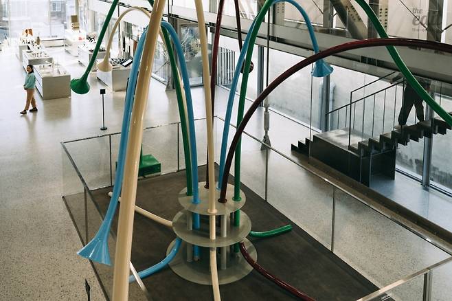 가장 먼저 만난 작품은 글로벌 사운드 아티스트 유리 스즈키(Yuri Suzuki)의 <히비키 트리(Hibiki Tree)>(2023). 처음 이 작품을 보며 들었던 느낌은 ‘사운드를 형상화한 것 같다’였다. 넓게 퍼지는 파동을 순간 캡처해서 시각화한 듯한 인상이었다. 아래에서 위로 커다란 관이 이어지고 사방으로 뻗친 모양이 역동적이면서도 고요하게 느껴졌다. 역동성과 고요함을 한 문장에 쓴 게 모순적이긴 하지만, 톤 다운된 색채, 크게 휘어 있는 자태를 보면 그런 느낌이 들 수밖에 없다.
