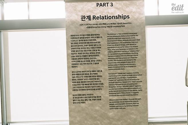 예술이 할 수 있는 건 대답이 아니라 질문이라고 생각한다. 대답은 연구를 하는 학자의 영역, 정치의 영역, 궁극적으로는 모든 개인의 영역이 아닐까. 물리적 개념으로만 한정 지었던 쉘터의 의미를 확장해서 ‘나에게 쉘터란 무엇인가’라는 질문을 던질 수 있는 의미 있는 전시였다. ‘나만의 쉘터’는 무엇일까, 생각하며 현대 모터스튜디오를 빠져나왔다.