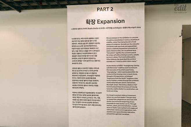 이제 파트 2로 넘어왔다. 파트2의 이름은 확장. 여기서는 고정된 거주지가 아닌 또 다른 의미로 발현되는 쉘터를 찾아나가는 과정을 보여준다.