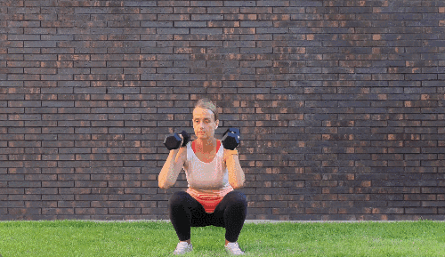 손에 아령을 잡고 팔꿈치를 구부린 상태에서 준비합니다. 무릎을 굽혀 스쿼트 동작을 수행한 뒤 다시 일어섭니다. 일어선 후에는 아령을 머리 위로 곧게 들어 올렸다가 내리며 동작을 반복합니다.