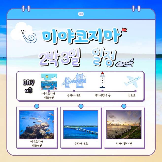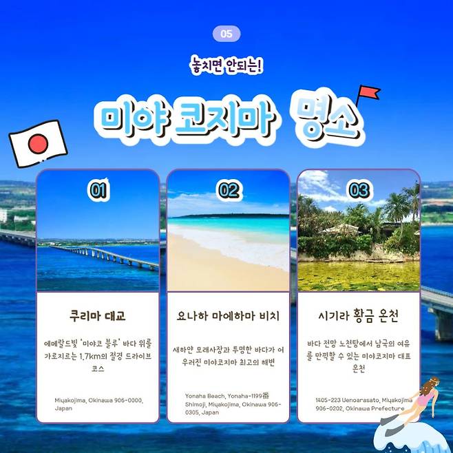 이 미야코지마 여행 코스를 참고하셔서, 미야코 블루의 환상적인 풍경과 여유로운 분위기를 꼭 한 번 경험해보시길 바랍니다.