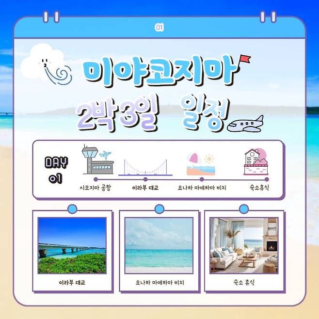 연중 기온이 따뜻하고 사람도 적은 환상적인 섬이라고 할 수 있죠. 이번에 소개할 2박 3일 미야코지마 여행 코스를 통해 일본 섬 여행의 매력을 느껴보시길 바랍니다.