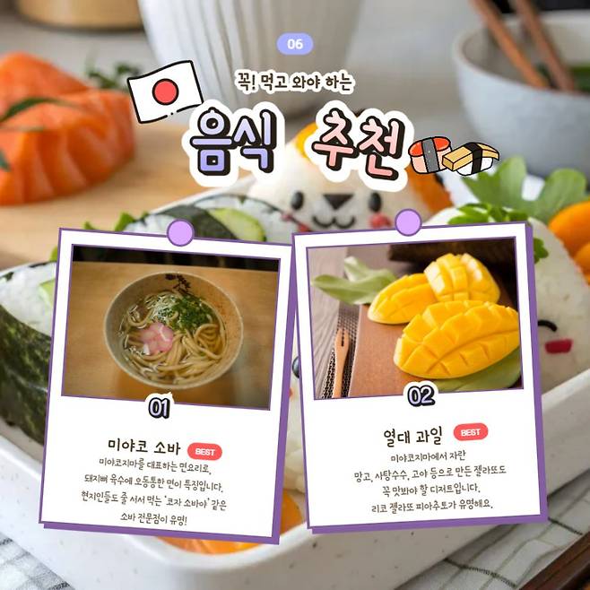 미야코지마에서 놓쳐선 안될 음식 중 하나가 미야코 소바와 열대 과일(망고)로 만든 디저트입니다. 본토와는 다른 맛을 자랑하는 미야코지마 음식으로 꼭 드셔보시길 추천해요.