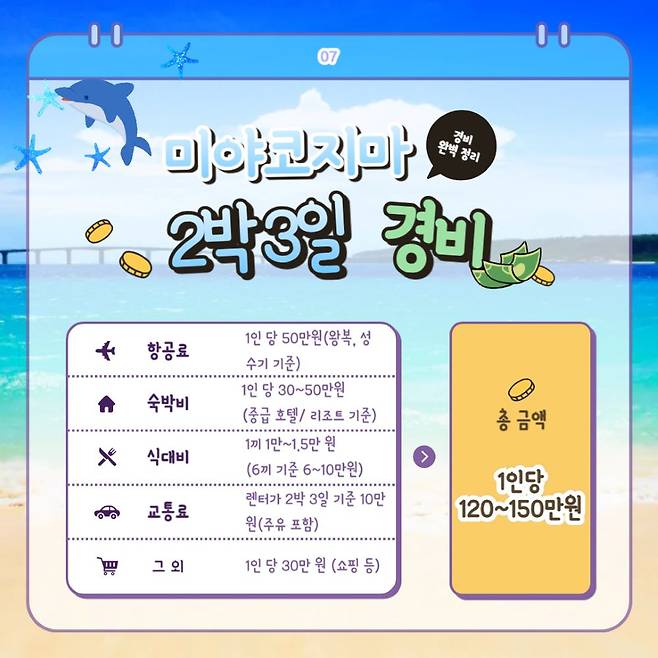 2박 3일 미야코지마 여행 경비는 성수기 기준으로 약 120~150만 원가량 들게 되는데요. 이는 성수기 기준으로, 비성수기 기준에는 항공권이 반 이상 저렴해지므로 참고용으로 보면 좋을 것 같습니다.