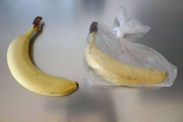 바나나가 에틸렌 가스를 가장 많이 내뿜는 부분은 꼭지입니다. 바나나 송이의 꼭지 부분을 랩으로 감싸두면 가스 배출이 줄어들어 변색 속도가 느려집니다. 가능하다면 하나씩 분리해서 꼭지마다 랩을 씌우는 것이 더 효과적입니다.