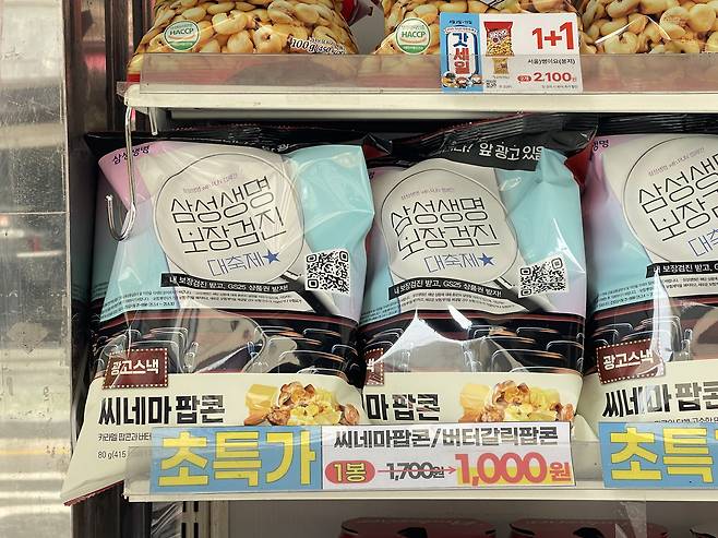 삼성생명에서 GS25의 PB상품인 버터갈릭팝콘을 광고판처럼 사용했어요.