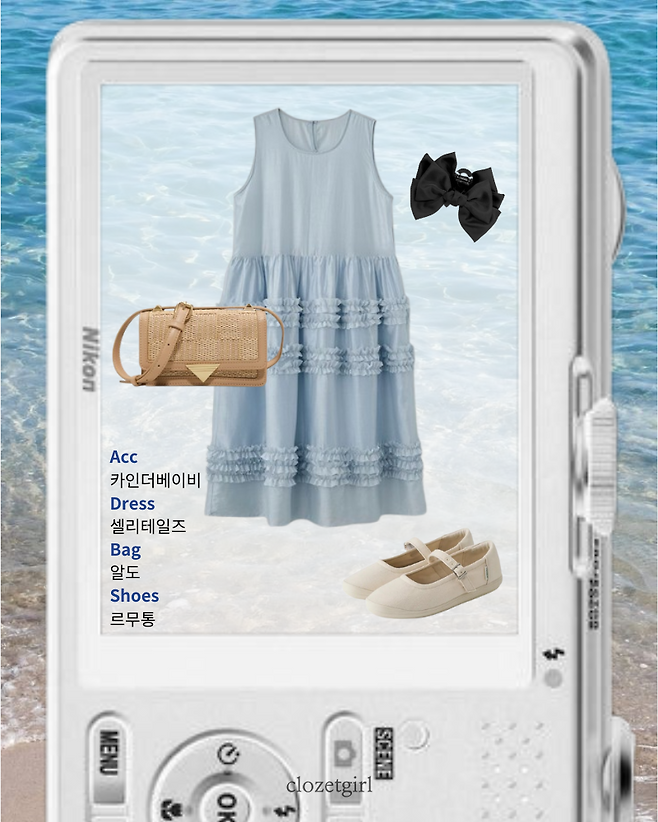 셀리테일즈의 프릴이 포인트인 하늘색 원피스와 알도의 라탄백느낌의 크로스백,더우니까 시원하게 머리를 묶어주기 위한 리본 모양의 카인더베이비 집게핀과 크림색상의 르무통의 메리제인 슈즈로 러블리함 가득한 코디를 구성해봤습니다~💘