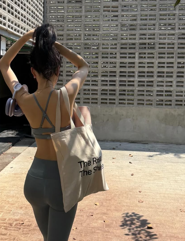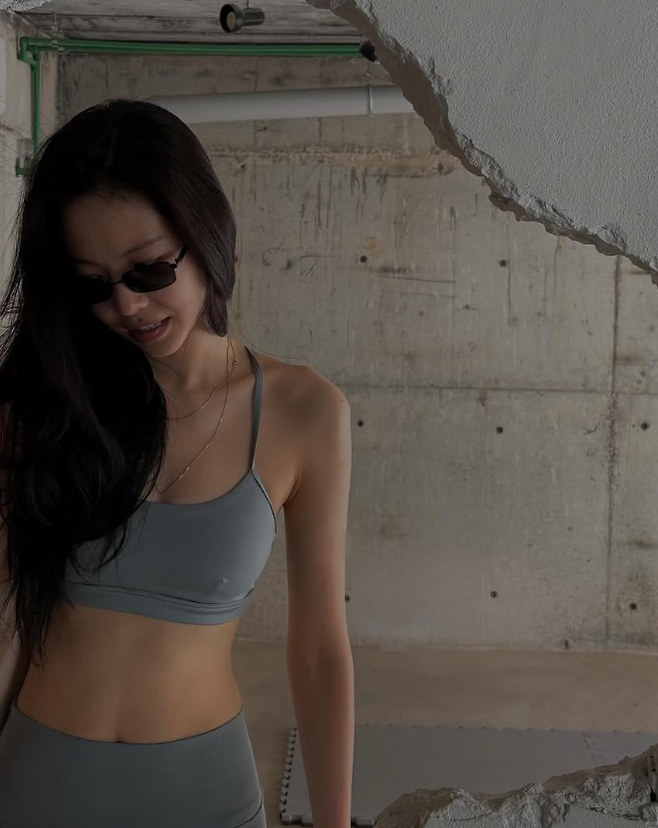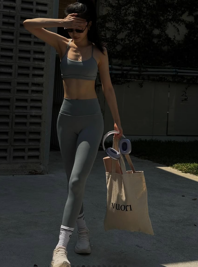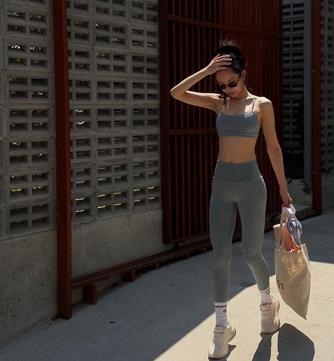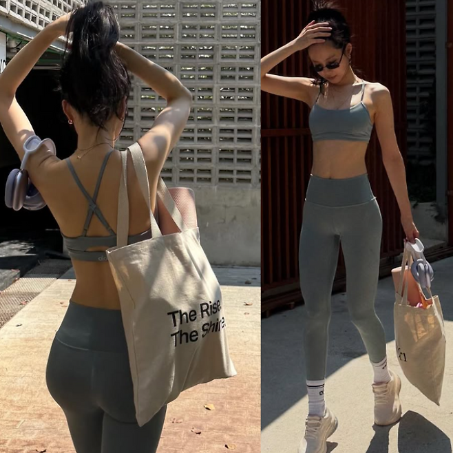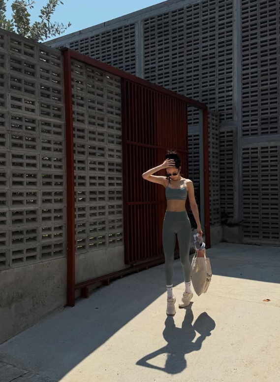 상의는 심플한 디자인의 그레이 브라톱으로, 하의는 같은 컬러의 레깅스를 매치해 통일감 있는 스타일을 연출했어요. 핏이 몸을 타고 흐르며 그녀의 군살 없는 탄탄한 바디 라인을 강조해 주었고, 시그니처 개미허리와 각선미가 더욱 도드라져 보였답니다.
