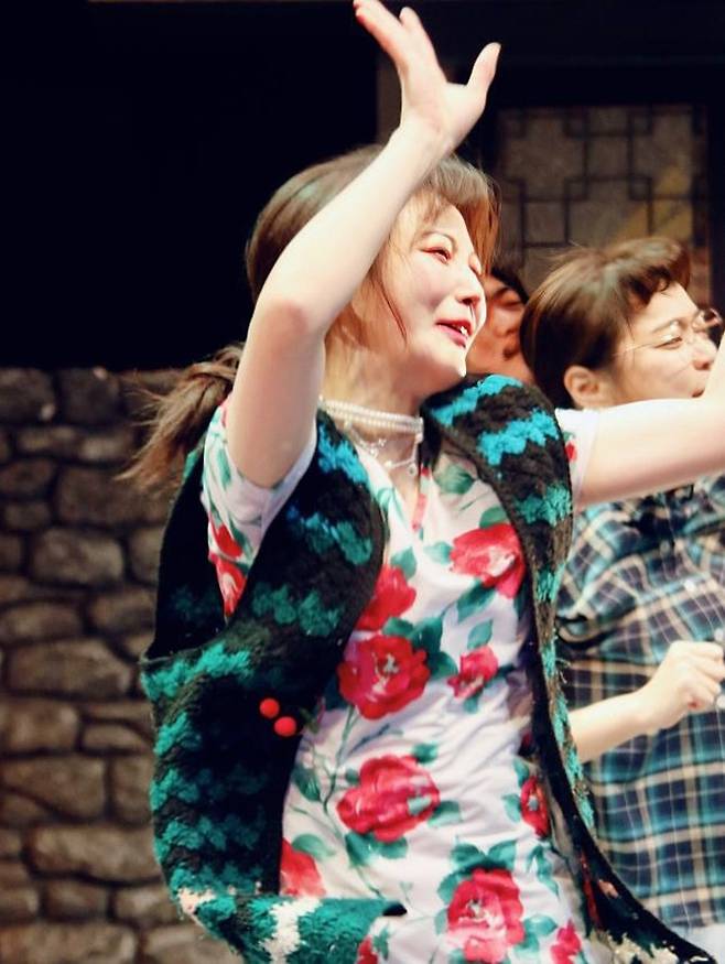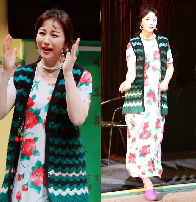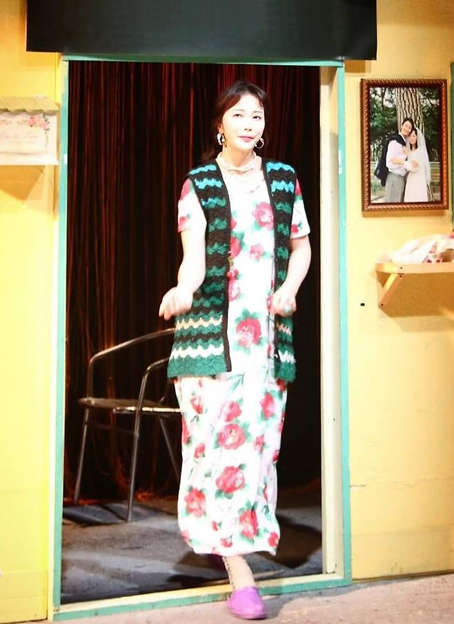 공개한 사진에서 안혜경은 화려한 꽃무늬 원피스에 녹색 니트 카디건을 걸친 연극 무대룩을 선보였다.