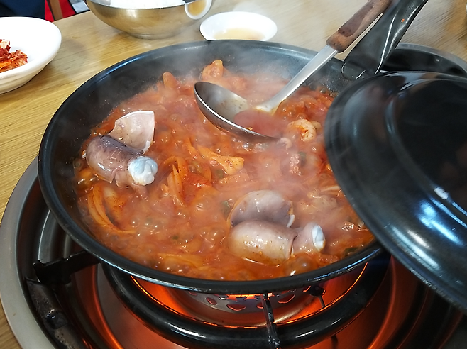 낙지 머리는 이렇게 낙곱새에 넣어서 같이 끓여주십니다