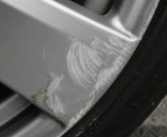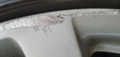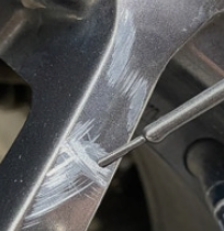 휠의 긁힌 부분은 페인트와 보호 코팅이 모두 벗겨져, 금속(알루미늄)이 그대로 노출된 상태입니다.
