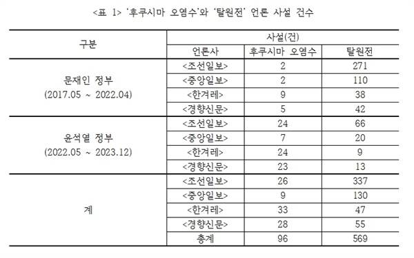 '후쿠시마 오염수' 검색어는 전반적으로 일본 후쿠시마 방사능 오염수 관련 찬반 논쟁과 담론 투쟁 상황을 확인할 수 있고, '탈원전' 검색어는 우리나라 핵발전과 재생에너지 정책에 대한 논쟁을 엿볼 수 있다. 조사 기간 4개 언론사의 '후쿠시마 오염수' 사설은 모두 96건으로 <한겨레>가 33건(34.4%), <경향신문> 28건(29.1%), <조선일보> 26건(27.0%), <중앙일보> 9건(13.0%) 순이다.