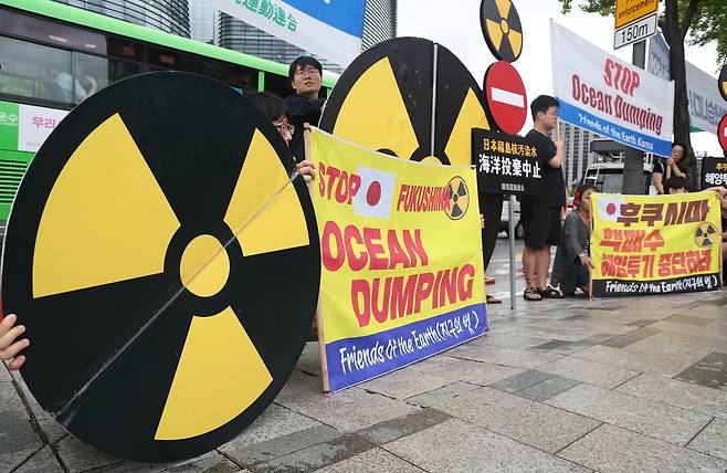 | ▲ 후쿠시마 해양투기 중단 촉구 기자회견 환경보건시민센터와 환경운동연합 바다위원회 등 시민단체 회원들이 21일 서울 종로구 일본대사관 건너편에서 '후쿠시마 해양투기 1년, 중단 촉구 기자회견'을 하고 있다. |