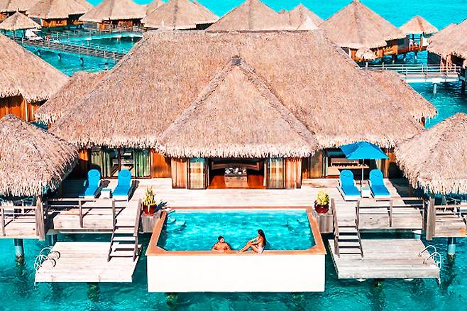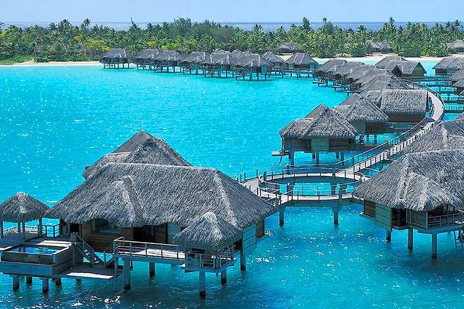 보라보라섬에는 다양한 초호화 수상 방갈로 리조트가 자리 잡고 있어 선택의 폭이 넓습니다. ‘더 세인트 레지스 보라보라 리조트’는 타히티에서 가장 큰 면적을 자랑하며, 최고의 서비스로 알려진 스타우드 호텔 그룹의 리조트입니다. 이곳은 총 91개의 객실을 보유하고 있어 바다 위에서 한껏 여유로운 시간을 보낼 수 있습니다. 1박 요금은 약 160만 원대입니다.