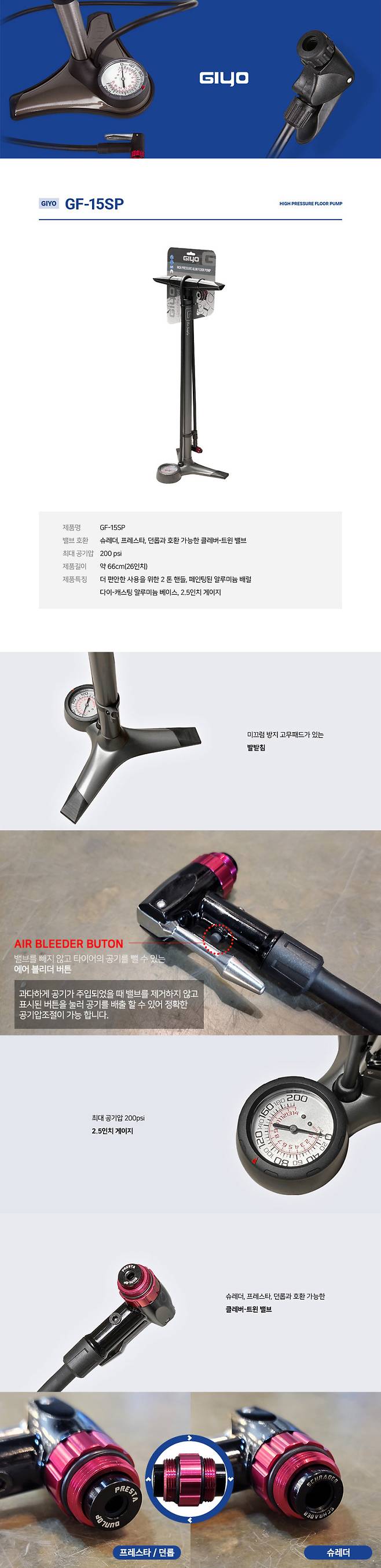 에어 블리더 버튼을 눌러 공기를 배출 할 수 있어 정확한 공기압 조절이 가능합니다.