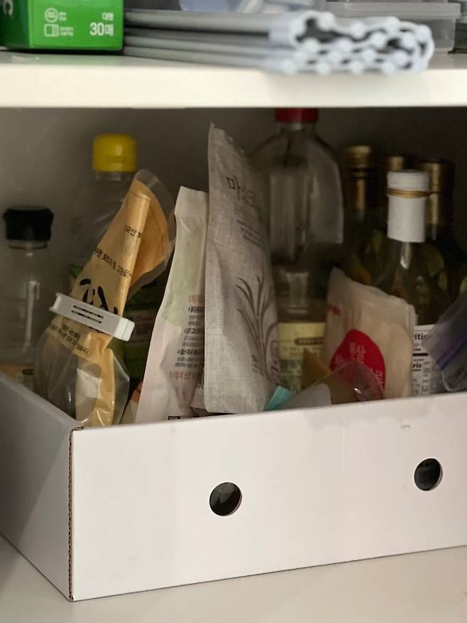 저는 과일 박스를 이렇게 양념 수납함으로 사용해요. 소분하고 남은, 큰 통이나 큰 봉지에 담긴 양념들을 이 박스에 모아 담아 하부장 구석에 두고 있습니다.