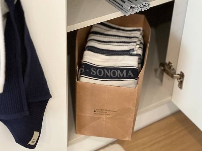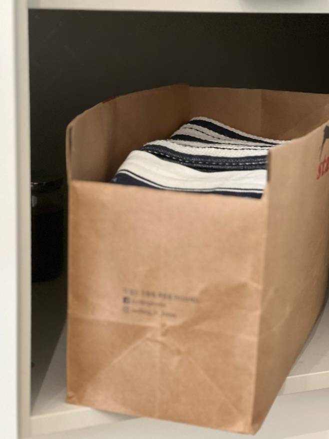 얇은 재질의 종이 쇼핑백이라면 가벼운 물건을 넣어 수납하는 게 좋아요. (예: 키친 클로스, 행주, 스펀지 등등)