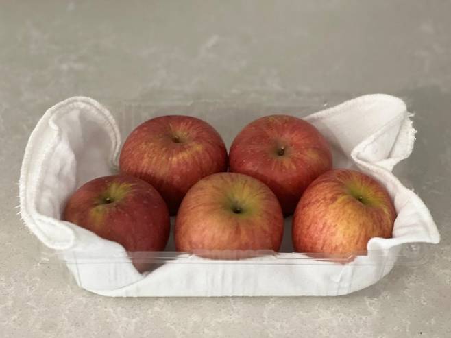 사과의 경우 깨끗이 씻어 물기를 말려 플라스틱 통에 면보를 깔아 보관합니다. 바로바로 하나씩 꺼내어 먹기 편해요.