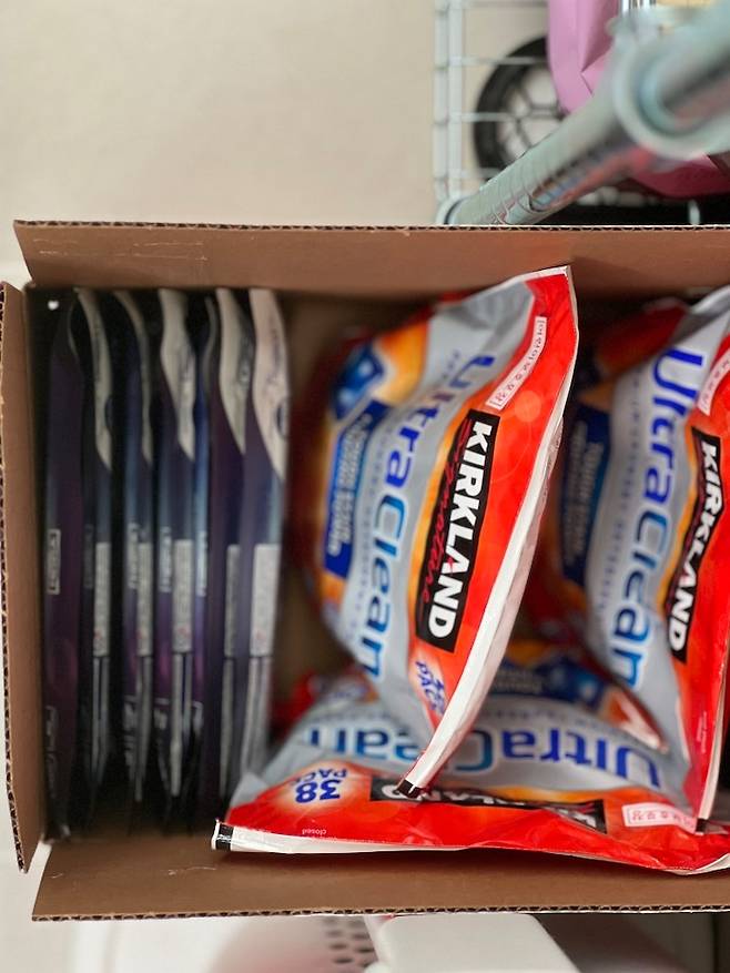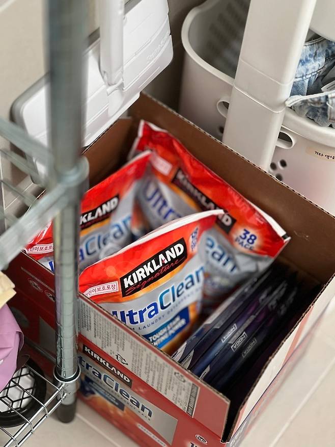 세제 박스도 그냥 버릴 순 없죠. 저는 두 가지의 세탁 세제를 사용하고 있어요. 이 두 가지를 한 박스에 넣어 보관합니다.