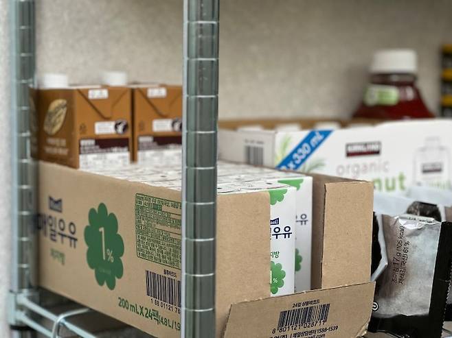 팩 우유가 담긴 박스도 배송 온 그 모습 그대로 두어 보관 박스처럼 사용하는 데 우유를 소비하면서 빈 공간이 생기면 다른 음료를 넣어 박스를 채워 수납합니다.