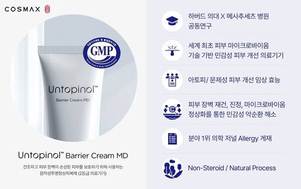 13일 코스맥스는 피부 마이크로바이옴 기반 소재 '언토피놀'(Untopinol)을 탑재한 MD크림(점착성투명창상피복재)에 대해 의료기기 GMP 적합 인정을 획득했다고 밝혔다. 코스맥스는 이번 인증 획득을 토대로 병의원용 제품 개발을 확대할 방침이다.