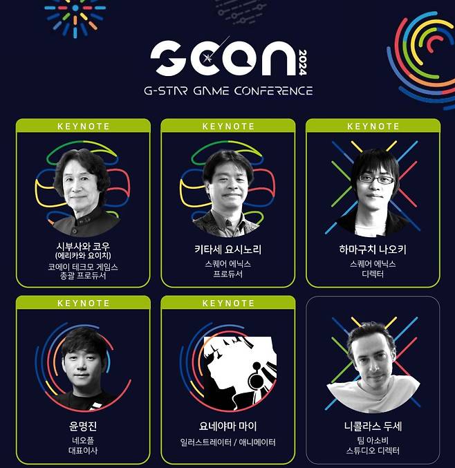 2일차 키노트 세션에서는 업계 내 뛰어난 일러스트레이터 요네야마 마이, 코에이 테크모 게임스의 시부사와 코우(에리카와 요이치)가 연단에 오른다. 이외에도 올해 컨퍼런스에서는 '아스트로봇' '소녀전전' '로블록스' '마블 스파이더맨' '블루 아카이브' '사이버 펑크' '다키스트 던전' '프로스트 펑크' '발더스 게이트3' 등 전세계 유명 타이틀의 핵심 개발자 다수가 연사로 나서 풍성함을 더할 예정이다.