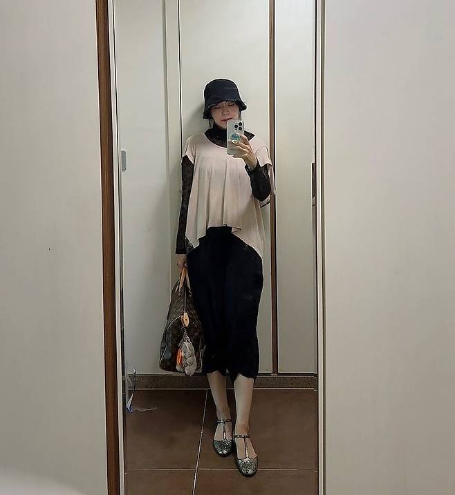악세서리로는 블랙 버킷햇과 빅 사이즈 패턴 토트백을 선택해 실용성과 스타일을 모두 챙겼다. 특히 버킷햇은 얼굴선을 부드럽게 감싸주며 소녀미와 시크함을 동시에 전달하는 아이템으로 활용되었고, 고급스러운 가죽 질감의 백은 스타일에 힘을 실어준다.
