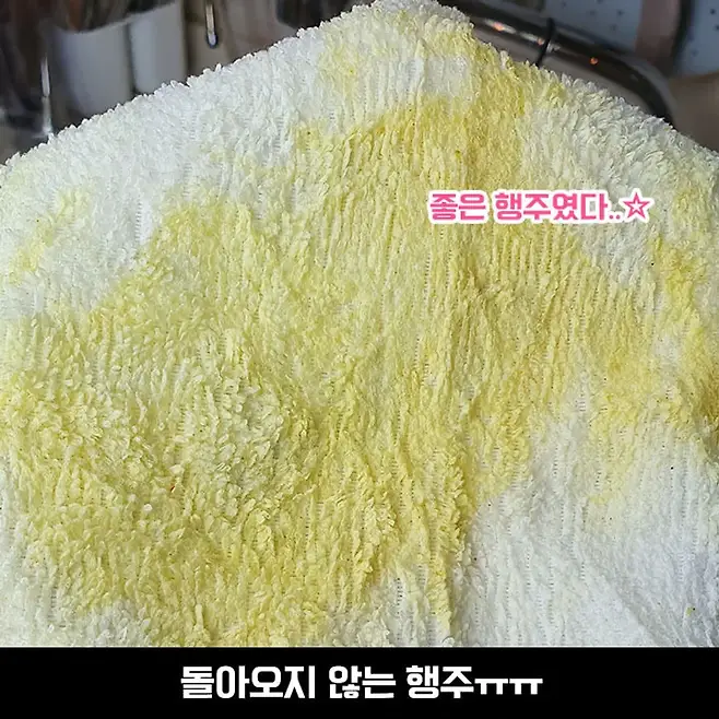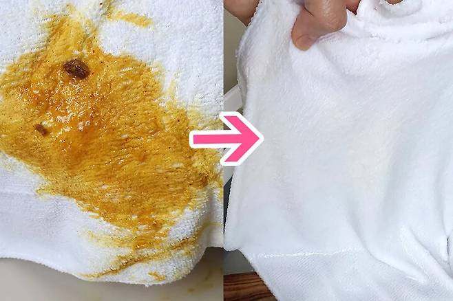 여러분 정말 대박 나왔습니다! 역시 세탁하실 때 많이 사용하시는 데에는 이유가 있었던 것이었어요. 조금의 흔적이 남아있던 플라스틱과는 다르게 아예 새 행주처럼 깨끗해졌어요.