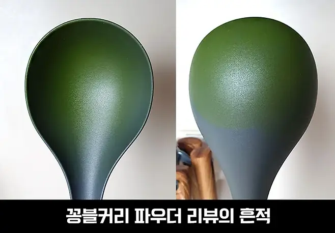 처참한 모습의 국자..ㅎㅎ 노란색도 아니라 완전 형광 연두색이 되어버렸어요..