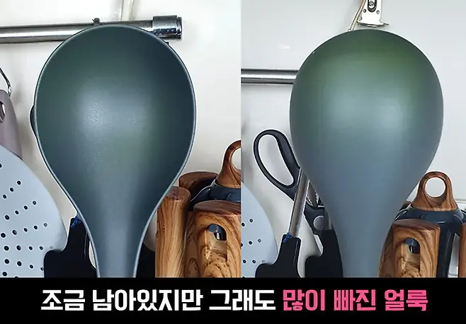먼저 오늘의 시작이 되었던 국자! 앞면은 정말 티가 안 날 정도로 전부 빠졌고, 뒷면은 아직 좀 남아있어요. 엄청 연하게 남아 있는 정도라 햇빛에 살짝 말려주거나 사용하다 보면 아예 깨끗하게 돌아올 것 같아요!