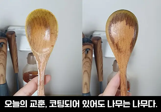 오늘의 유일한 실패작。゚(゚∩´﹏`∩゚)゚。 오히려 담그기 전보다 색이 더 심해졌어요..ㅋㅋㅋ 코팅이 되어있는 제품이라 괜찮을 줄 알았는데 역시 나무라 장시간 담가두는 건 무리였나봐요ㅠㅠ 여러분들은 코팅되어 있다 안심하지 마시고 나무제품은 담그지 않으시는 걸로..