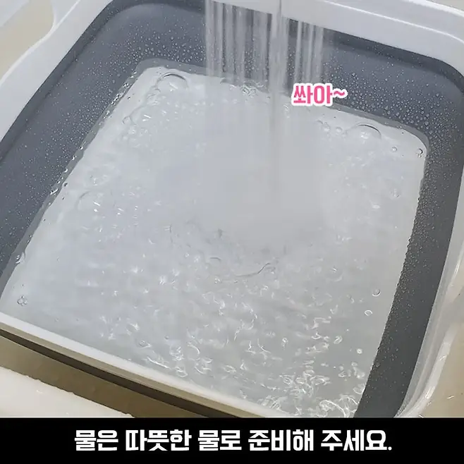 먼저 물을 받아줍니다. 과탄산소다는 60도 이상의 온도에서 반응을 한다고 하니, 따뜻한 물로 준비해 주세요~