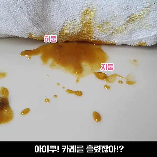 어머! 카레를 담다가 흘려버렸네!? 상판 물들기 전에 닦아야 해!!