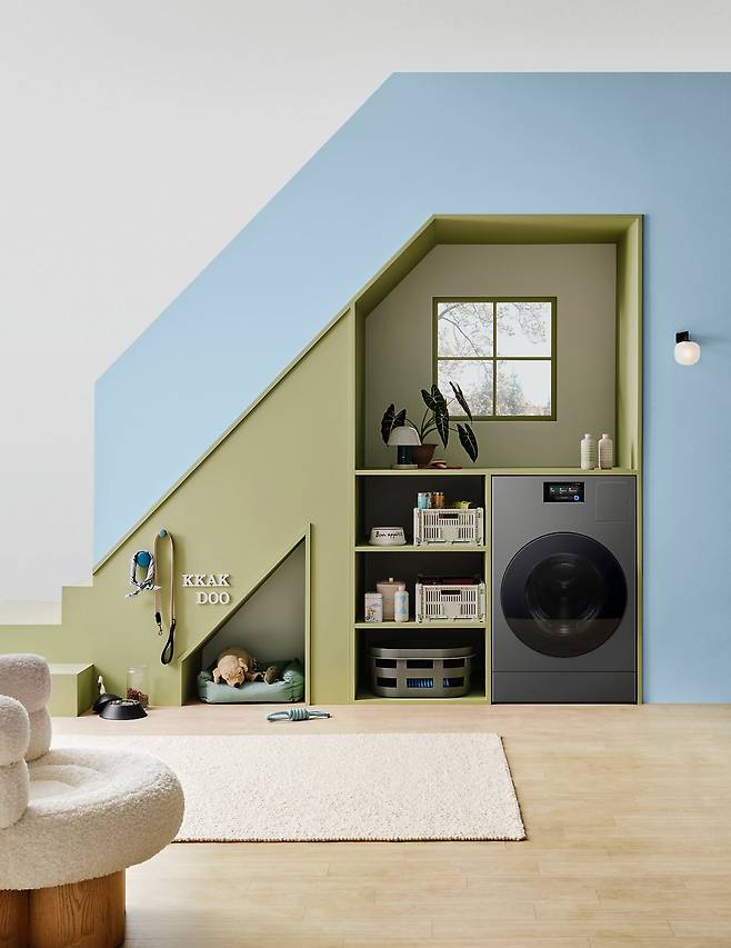 복층 집에 살고 계신다면 이 공간을 눈여겨보세요. 계단 아래처럼 활용하기 애매한 공간을 런드리룸으로 꾸민 파격적인 모습이에요. 이런 구조가 가능했던 건 여러 번 언급해도 모자란 더욱 낮아진 높이, 그리고 전면 배치 먼지 필터와 조작부 덕분이에요. 덕분에 공간 활용력을 극대화해 주었으니까요. 또 레브르홈은 이곳, 수납공간으로 쓰기도 난감한 가장자리에 반려동물의 보금자리를 만들었습니다. 놀라운 센스에 반하겠는걸요.