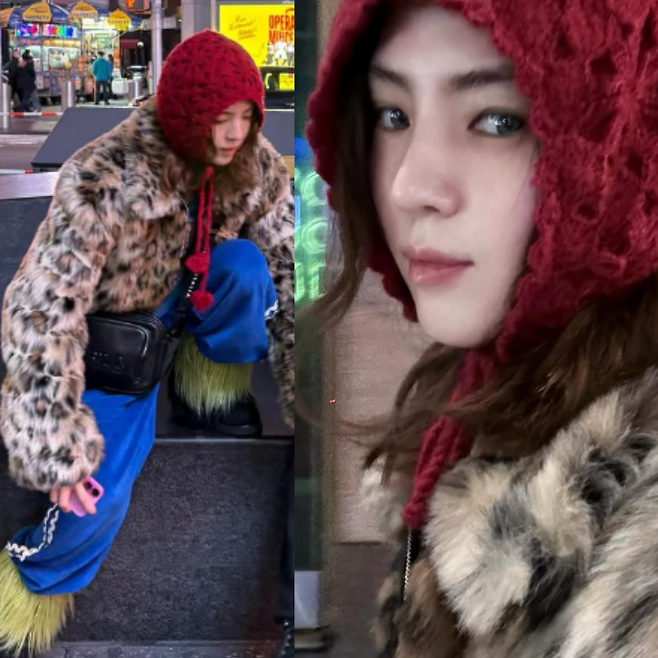 빨간색 모자와 빨간색 스트라이프 워머는 이 스타일의 중심 포인트로, 컬러 믹스를 더욱 대담하게 만들어줬어요. 강렬한 빨간색은 룩에 에너지를 추가하면서도 전체 스타일에 재미있는 포인트가 되었죠.