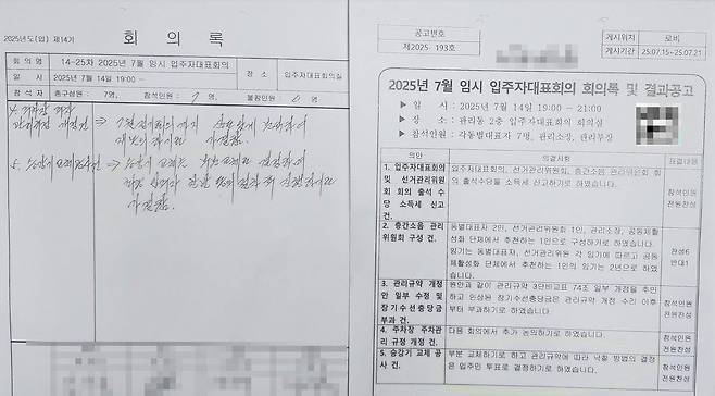 | ▲ 입주자 대표회의 회의록과 회의결과 공지, 승강기와 관련한 내용이 다르다. |
